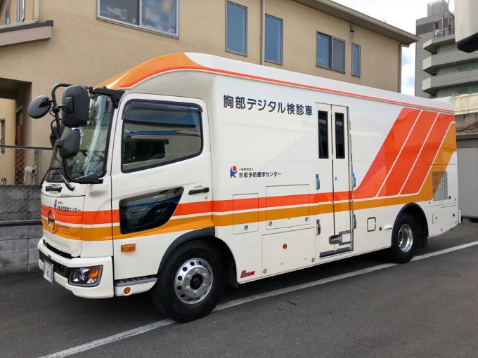 平成30年1月。胸部デジタル検診車を更新しました。今回の検診車は、環境に配慮した当センターで初の蓄電池搭載検診車です。フル充電で6時間の稼働可能なので、電源状態の悪い場所でも発電機の排ガスに悩まされず検診が可能となっています。